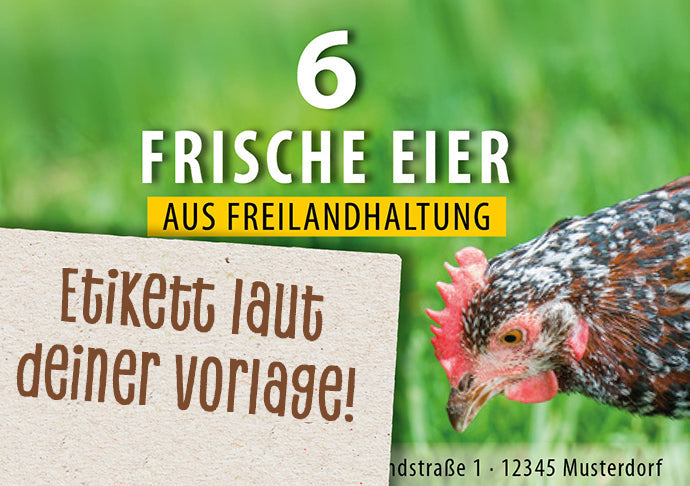 Réussir l'élevage de poules et améliorer la production d'œufs est un aspect essentiel. Une commercialisation efficace et performante à la ferme et des ventes satisfaisantes en sont un autre. Les étiquettes personnalisées pour boîtes d'œufs jouent un rôle de plus en plus important dans la commercialisation des œufs. Nous imprimons des étiquettes pour boîtes d'œufs selon votre design, même en petites quantités. À partir de 584 étiquettes seulement, nous imprimons vos étiquettes pour boîtes d'œufs de 6 unités selon votre visuel, avec une qualité d'impression exceptionnelle.